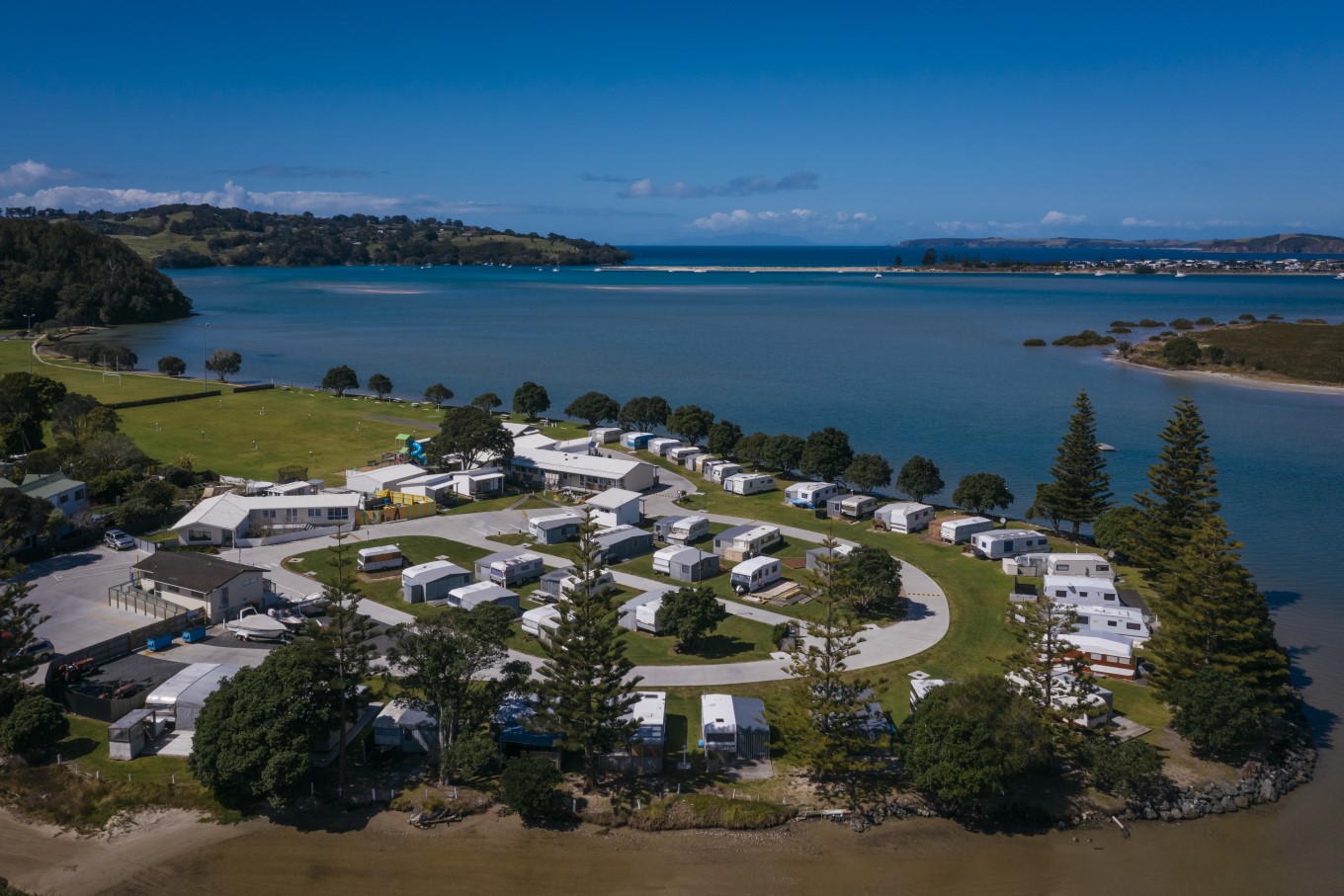 A similar distance from Auckland to Martins Bay, is the hidden gem of a waterfront holiday park on Whangateau Harbour between Matakana and Leigh.