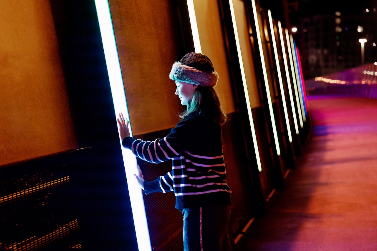 “As someone moves along the Lightpath, the lights change from magenta to a colourful display in response to their movement, and as people pass each other the colours merge and intensify expressing positivity as people connect,” she says.