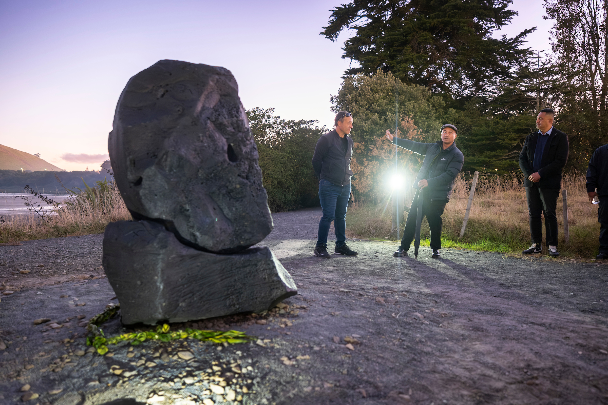 The sculpture, crafted from basalt rock excavated during the Watercare Central Interceptor tunnel project, was transformed by Ngāti Te Ata Waiohua artist Pāora Puru and sculptor Chris van Doren.
