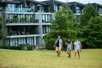 School children walk past new apartments and Te Ara Awataha Greenway. Bridge in a safe, green, and connected neighbourhood in Northcote