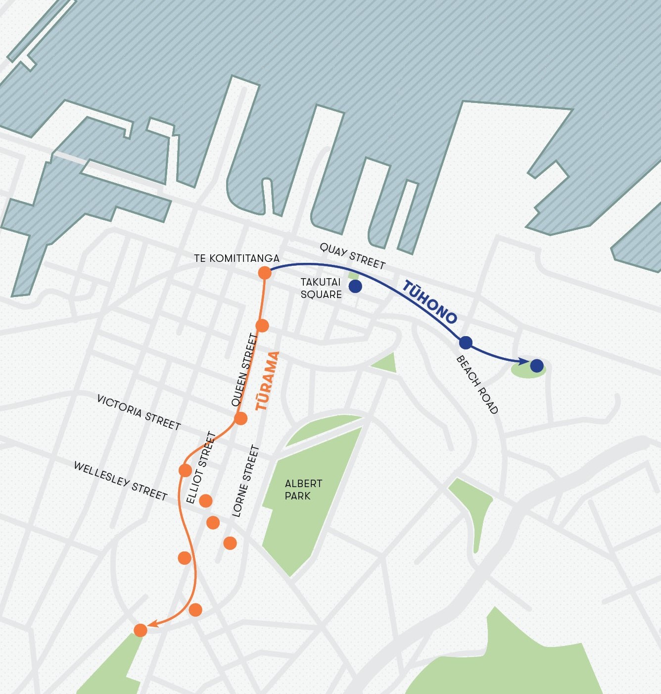Reach the original foreshore, between Shortland and Fort Streets, and you’ll see the majestic Te Wehenga. Walk beneath Te Wehenga and illuminated imagery will evolve from whenua (land) to moana (sea.) Te Wehenga marks the approximate meeting point of Tangaroa (ocean deity) and Tāne Māhuta (deity of the land).