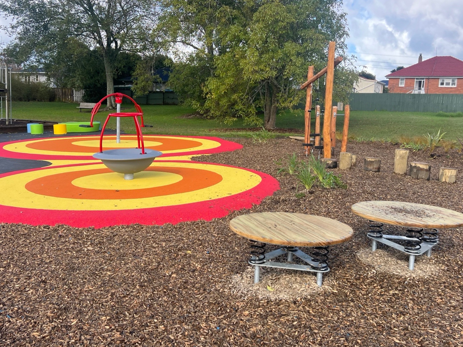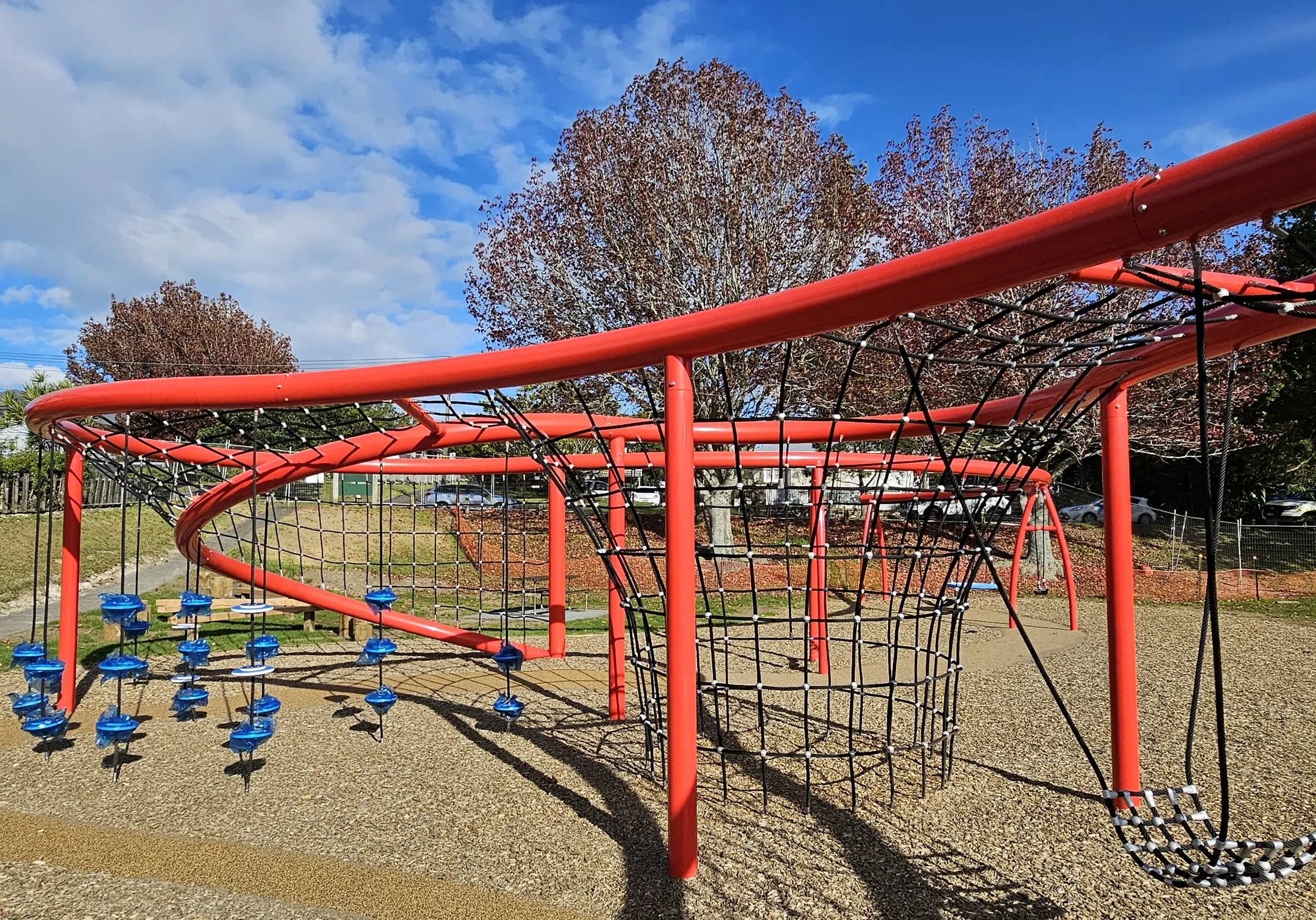 Reopened in 2024, this playground is packed with fun. Tamariki can climb up the big red module with rope nets, swing on the basket swings, or play safely on the soft bark and rubber surface. Next to it, a natural play zone with wooden balance beams and stepping logs adds to the adventure.