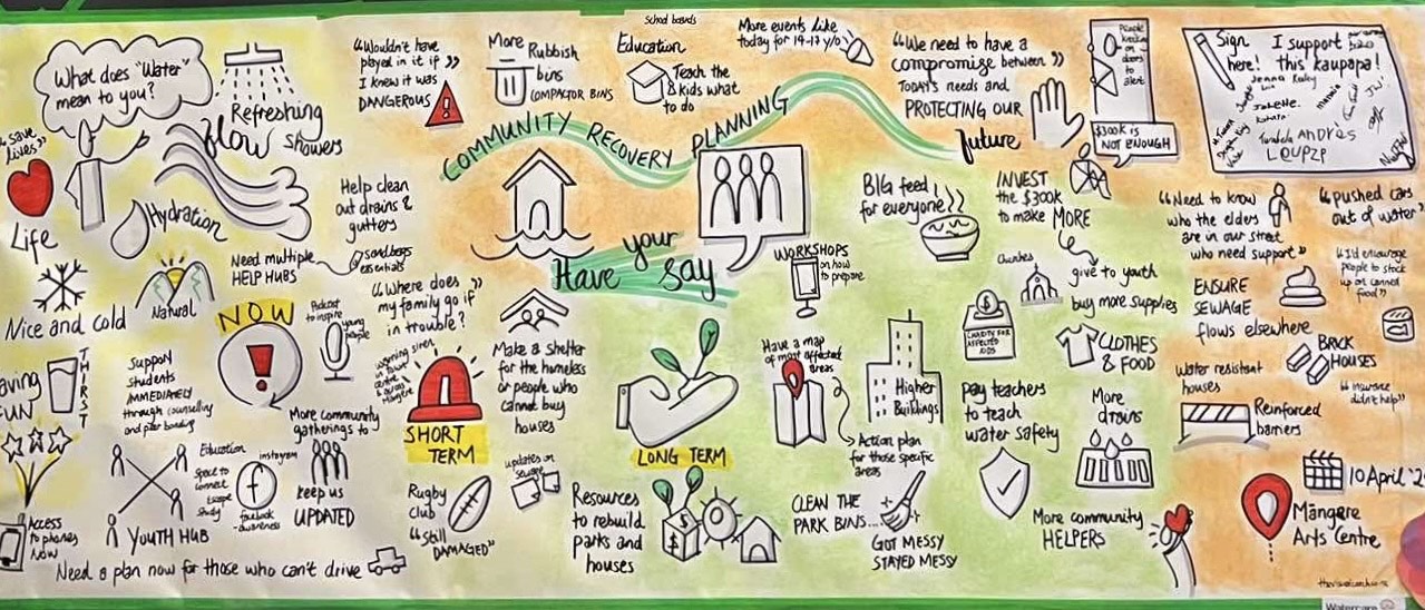 Puhoi residents contributed to a photo exhibition of more than 300 images of local places, people and events, with contributors and visitors sharing their ideas for the community’s future and what mattered most to them. In Milford, a public storyboard was created and has been installed in multiple locations across the storm impacted areas of Milford. It is prompting conversations about what happened, what stands now, and what people want to see next.