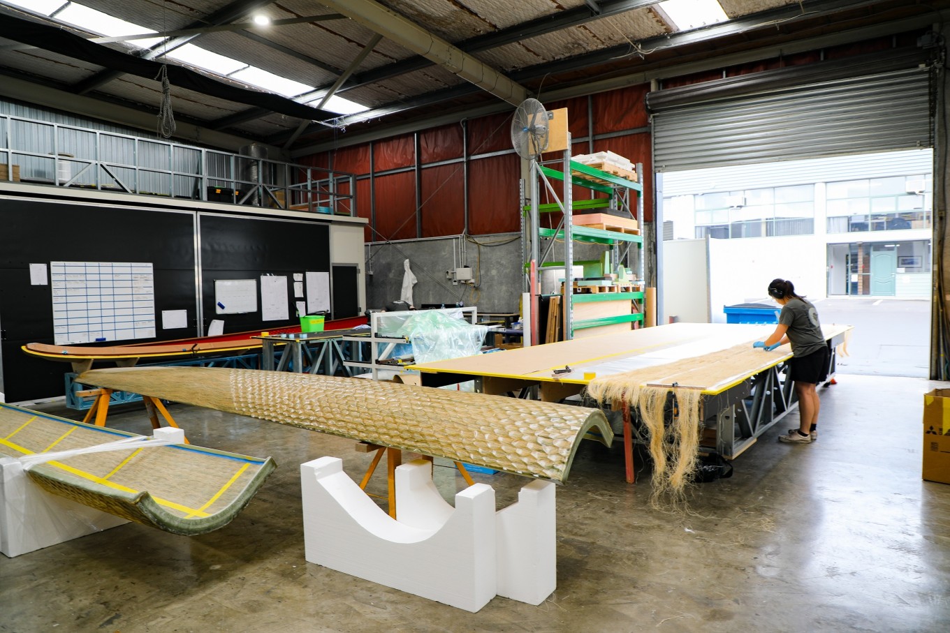 Each of the nine towering waka hulls is made using a fusion of traditional and contemporary techniques. Muka-infused fibreglass reinforced plastic is carefully laid into custom moulds, heated, and lifted out to form the hulls.