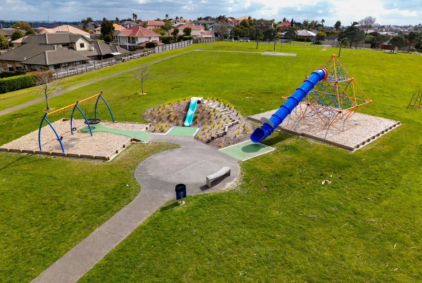 This once simple play space in Māngere is no more – Rock Daisy rocks a whole new look nowadays! Upgrades include new swings, a slide, spinning structure, nature play area, fun jumping and balancing equipment, picnic tables, and open lawn areas for play or picnics.