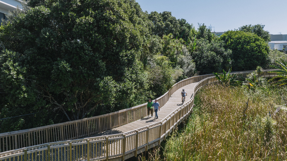 Patuone Walkway connects people and nature – a scenic, step-free path from Esmonde Road through mangroves and native bush to Takapuna’s Auburn Reserve. Loved by cyclists, walkers, and families alike.
