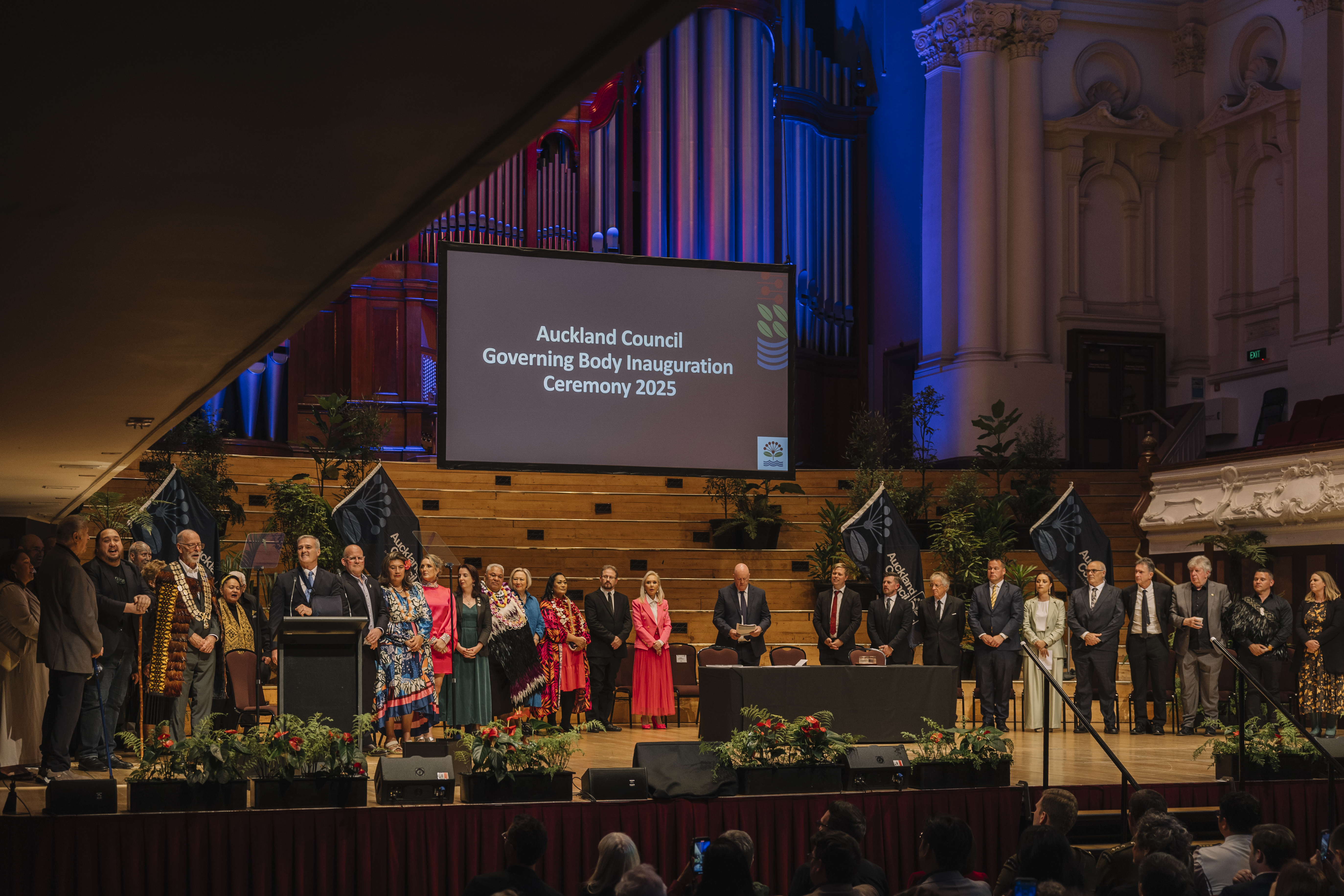 Tangata whenua formally welcomed the Governing Body members into the hall and on stage through a pōhiri ceremony, with Ngāti Whātua Ōrākei spokesperson Taiaha Hawke reflecting on the interconnection between cultures in Tāmaki Makaurau.