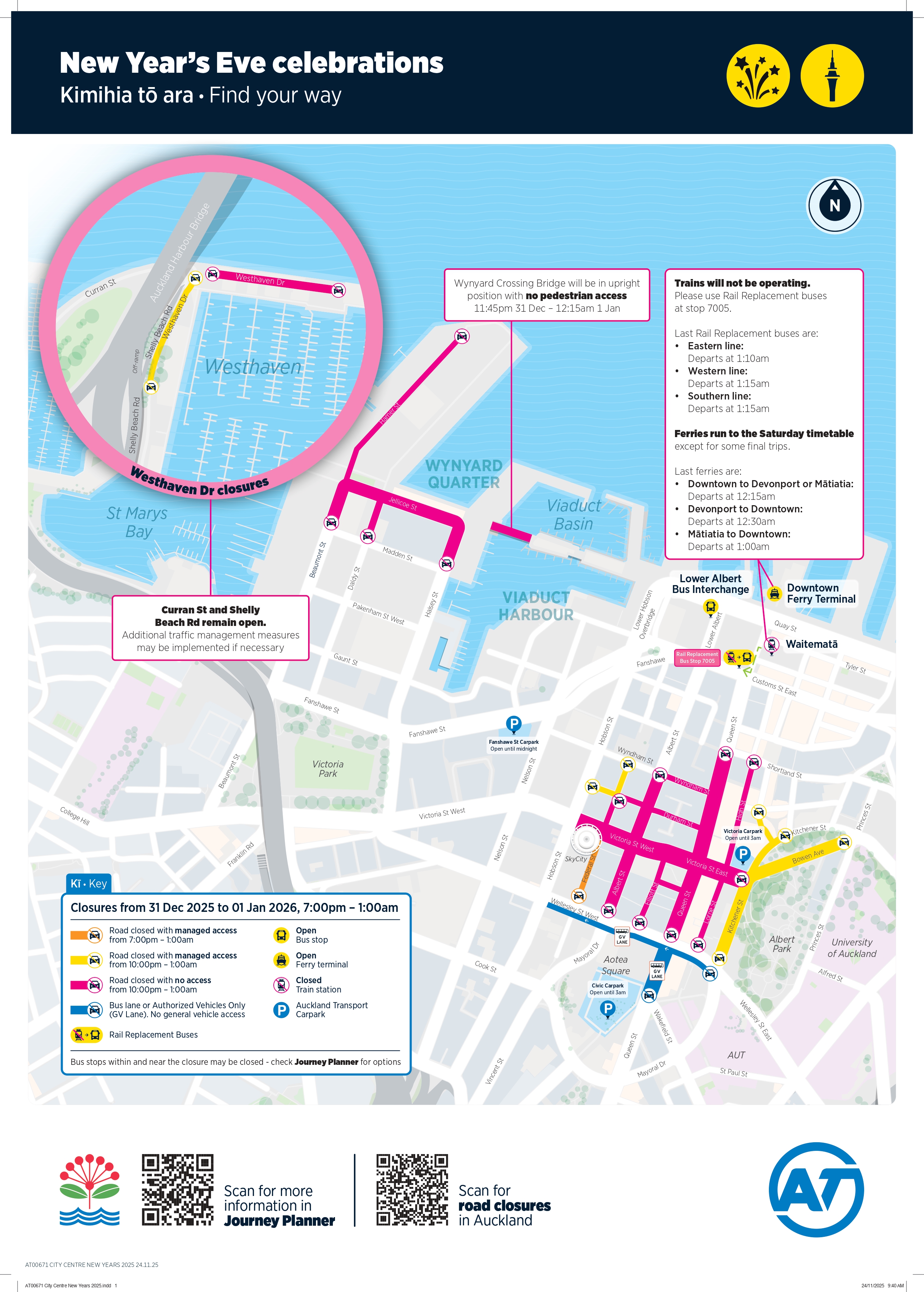 - The southbound clip-on lanes (lanes 1 & 2) of the Auckland Harbour Bridge will be closed on New Year’s Eve, including the off-ramp to Shelly Beach Road. Access will be available from Westhaven Drive through to Shelly Beach Road.