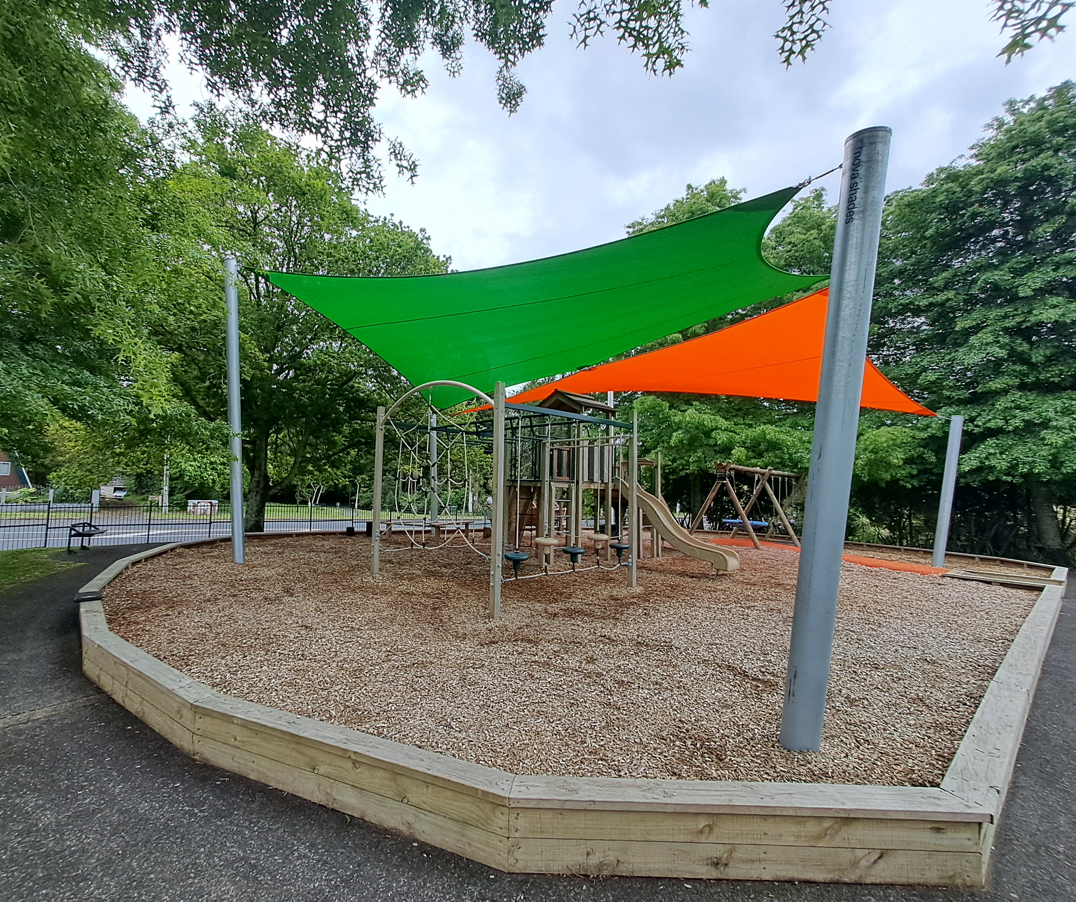 The playground is equipped with double and single slides, spider web climbing frame, monkey bars, tunnel for crawling, balance beams, two swing bays (one with a basket swing), stepping stones, scaling wall.